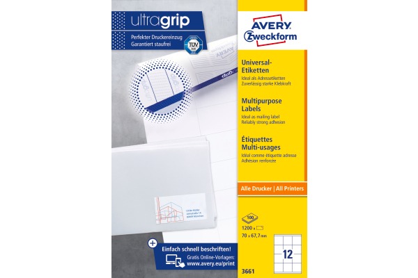 Quels que soient vos besoins, vous pouvez compter sur la polyvalence des étiquettes blanches universelles d’Avery Zweckform – que vous souhaitiez étiqueter vos documents, organiser vos dossiers, identifier ce qui vous appartient ou mettre de l’ordre dans vos armoires. En outre, ces étiquettes sont extrêmement faciles à séparer grâce au système pratique QuickPeel.