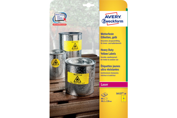 Die gelben, wetterfesten Etiketten zeichnen sich durch eine extreme Strapazierfähigkeit im Innen- und Außenbereich aus. Durch die starke, permanente Haftung eignen sie sich besonders zur wetterfesten und dauerhaften Kennzeichnung. Die reiß- und wasserfesten Folienetiketten sind deutlich strapazierfähiger als Papier-Etiketten, öl-, schmutz-, UV- und temperaturbeständig (-20° bis +80°C).
