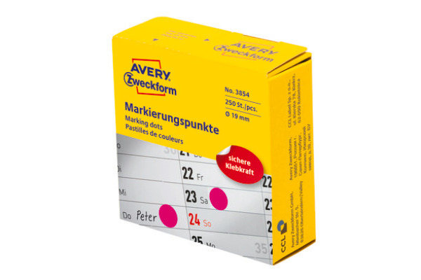Die selbstklebenden Markierungspunkte von AVERY ZWECKFORM werden in einem handlichen Spender angeboten. Sie sind ideal zum Kennzeichnen, Ordnen, Organisieren, Terminieren und Planen.
