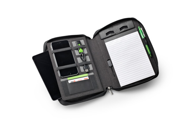 La serviette de conférence «Smart Organizer», disponible aux formats A4 et A5, est idéale pour le travail nomade. Grâce à sa batterie externe intégrée (5000 mAh), vous pouvez recharger partout votre smartphone ou votre tablette. La serviette de conférence dispose de divers compartiments pour tablette, smartphone, documents, cartes de visite. De plus, il est possible de ranger les clés USB, les câbles de recharge etc. manière visible et propre. Fabriqué en tissu robuste et déperlant avec fermeture éclair périphérique.