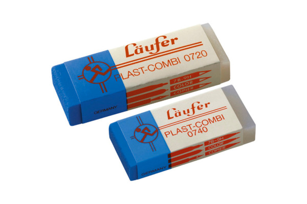 Die Kombination des Allround-Talents Läufer Plast für Blei- und Farbstifte mit dem blauen Spezialradierer für Kugel- und Faserschreiber, Tinte und Tusche.