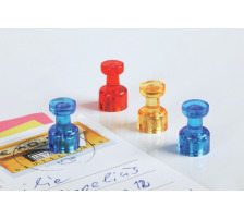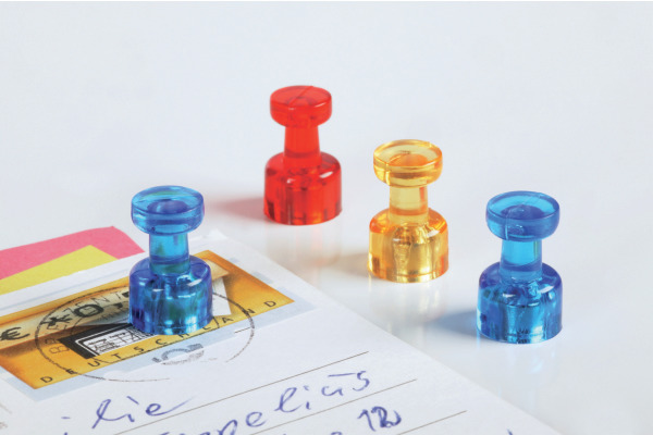 Les petites «quilles» colorées ne sont pas seulement décoratives, elles possèdent aussi une puissante force d’adhérence et peuvent supporter des brochures de plusieurs pages ou des feuilles de carton (jusqu’à 9 feuilles de format A4), Ø 11 mm. Longueur: 18 mm.