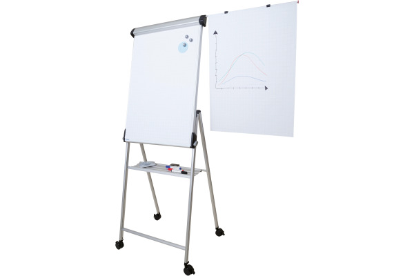 Das Design-Modell: Moderne Formensprache, im Detail konsequent umgesetzt. Die Tafel ist innovativ: Verschieben der Tafel nach oben mit einer Hand möglich, nach unten mittels leichtem Druck auf einen seitlichen Hebel. Tafel klemmt nach Verschieben mittels Keilwirkung selbstarretierend sicher fest. Zudem überzeugt auch die hohe Mobilität: Grosse, feststellbare Doppelrollen, besonders leicht zu transportieren und einfach aufzustellen (Easy-Transport-System).