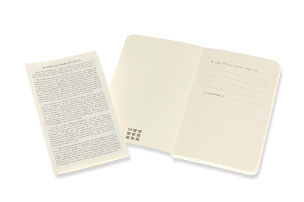 Les carnets Volant à couverture souple noire sont disponibles par lots de deux. Chaque lot dispose de pages lignées en papier sans acide et contient l’histoire de Moleskine.