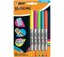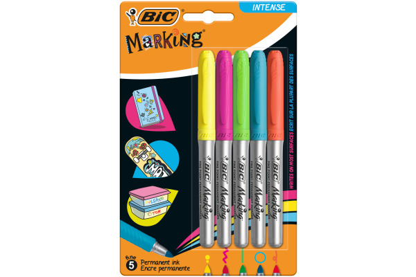 Permanent Marker BiC Marking Colour Intense . Bunte Permanent Marker in 12 kräftigen und leuchtenden Farben, halten auf fast allen Oberflächen, ideal zum Dekorieren und Basteln (von Boxen, Bücher, Surf, Metall, Kunststoff, beschichtetes Papier, uvm...) im praktischen Taschenformat; feine und formstabile Ovalspitze für eine Strichbreite von 0.8-1.8mm, mittlerer Kunststoff-Schaft in Silber mit Gummi-Griffzone. Kappe mit Clip und Sicherheitsverschluss in der Schreibfarbe; permanente Tinte auf Alkoholbasis, geruchsarm, schnelltrocknend (< 5 Sek.); für beschichtetes Papier, Karton, Fotos, Metall, Kunststoff, Glas... . PVC-frei. 12 Assortierte, intensive Trend-Farben: sunset-orange, wild-red, fandango-pink, flamingo-pink, lemon-yellow, lime-green, black, warm-ocean-blue, lavender-blue, deep-ocean-blue, desert-rose, mango-orange. - 12 Kräftige und leuchtende Trend-Farben.