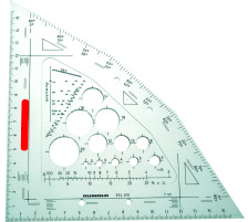 Der RUMOLD TECHNO-Combi-Winkel aus unzerbrechlichem Makrolon ist ein universelles Zeichendreieck mit abnehmbarem Haltegriff. Er hat feste Winkel von 15°, 30°, 45°, 60° und 90°, Kreise von 2-20 mm und Hilfslinien für Normschrift. In Verbindung mit dem TECHNO-Clip wird der Combi-Winel auf allen RUMOLD TECHNO-Zeichenplatten zum Schraffiergerät.