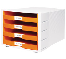 Schubladenbox IMPULS in moderner Optik mit 4 geschlossenen großzügigen Schubladen für Papierformate DIN A4/C4. Innovatives, attraktives Design in höchster Qualität. Inkl. großer auswechselbarer Beschriftungsschilder für ein einfaches Auffinden von Unterlagen. Leichtlaufende Schubladen mit Auszugssperre und durchgängig geschlossenen Boden auch zur Kleinteile Organisation geeignet. Extra stabiles Gehäuse aus einem Stück gefertigt. Stapelbar, dadurch Platz sparend. Rutschfeste, möbelschonende Gummifüße sorgen für einen sicheren Stand.