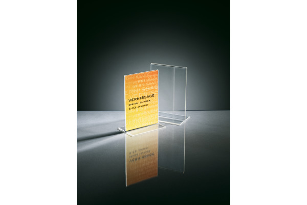Présentoir de bureau droit pour présentation recto verso de promotions, d'informations, d’offres, etc. Idéal pour comptoirs, tables, salles d’exposition et salons professionnels. En acrylique transparent 1,8 mm de haute qualité avec bords polis et lisses assurant un bon maintien. Acrylique garanti 25 ans contre le vieillissement aux UV.